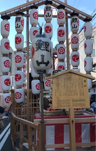 山鉾 鯉山 大きな鯉が跳躍し、龍門の滝を登る鯉の奔放な雄姿を表しているそうです 朱塗鳥居を立て、奥の祠に素戔嗚尊を祀っているのだそうです 京都市観光協会HPより 黒主山 謡曲「志賀」にちなみ大伴黒主が桜の花をあおぎながめている姿をあらわすのだそう…